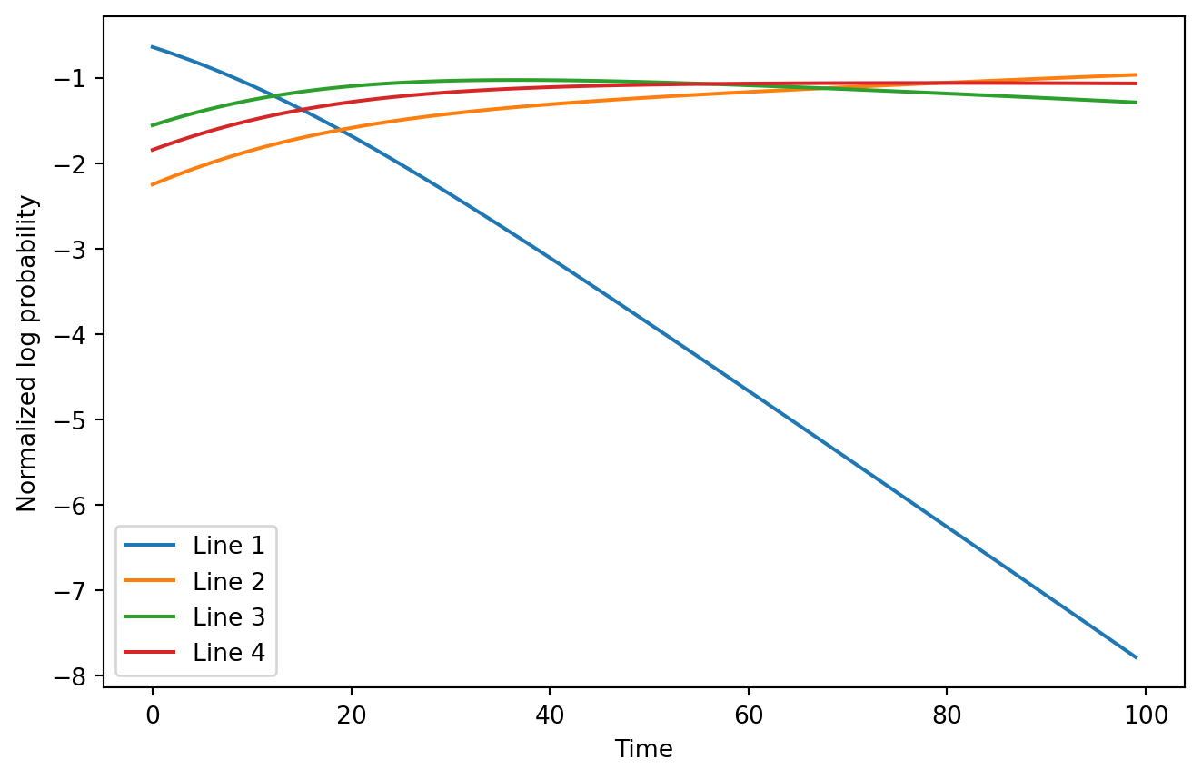 ..It is kind of hard to see the top log probability switch in this example, even when zoomed in to half the observations. However, it conveys the basic idea: we can more easily predict when lines will take over each other on a log scale plot without normalization. With normalization it would look much less obvious:
