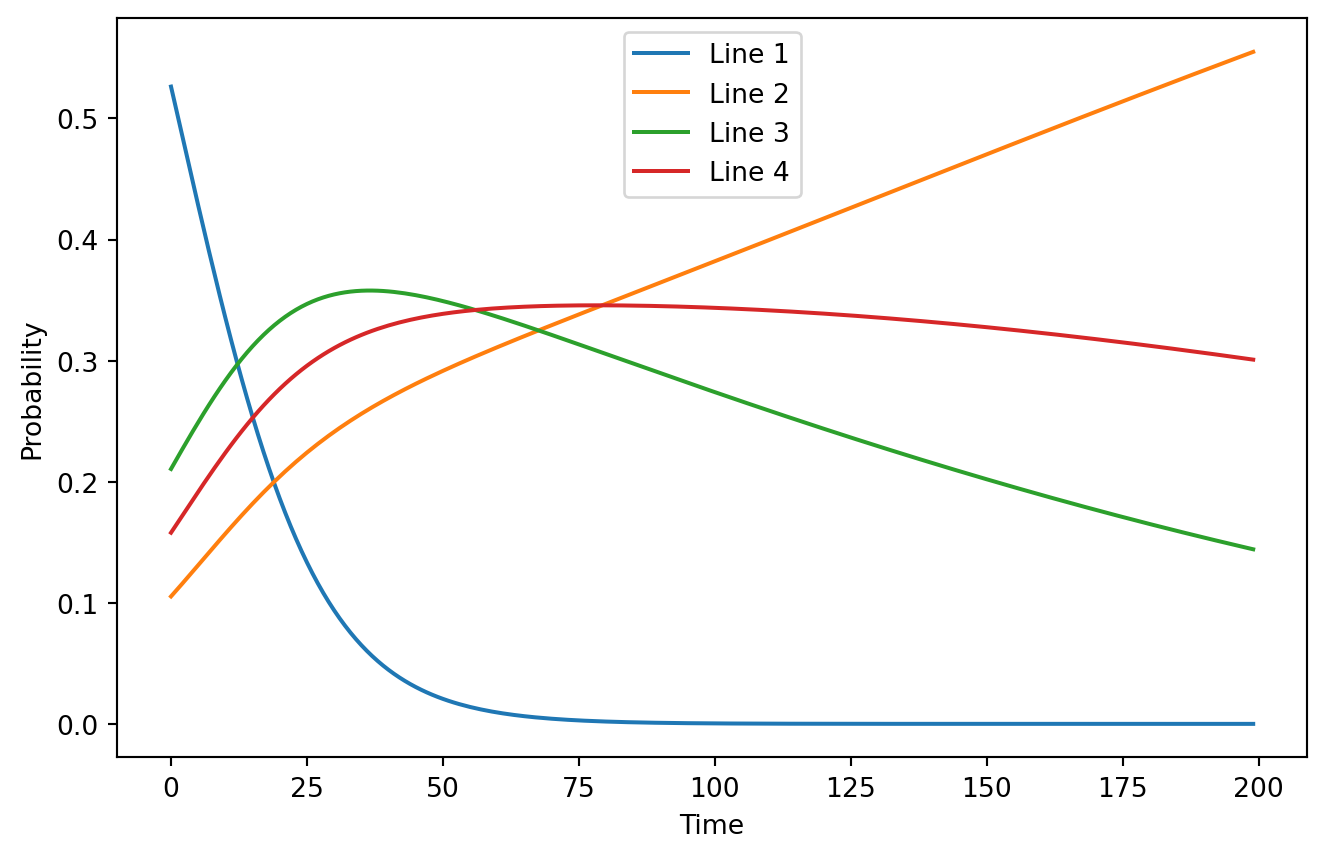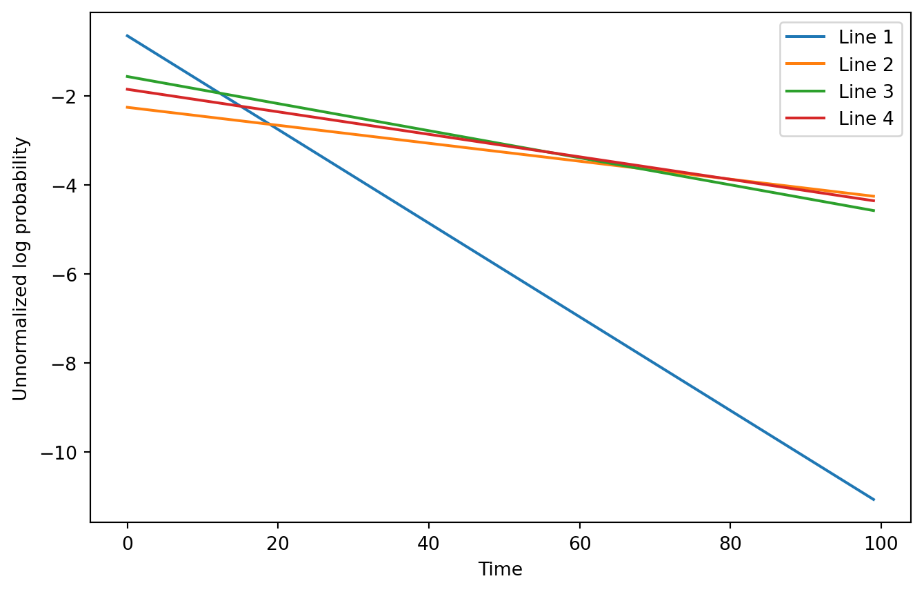 So, after steps of updating our log probability is . If we ignore the , the expression is linear in . Moreover, we know that each . This means that we have a set of downward sloping lines in unnormalized log space. It seems obvious when framing it this way that some of them may become the
